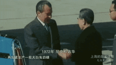 不仅如此,大白兔还曾经充当了“友好外交的象征”。1972年,美国总统尼克松的代表团秘密访华,在准备招待食品的时候,不但需要体现中华文化的传统,也得显示出现代化的生活水平。在《上海的甜蜜往事》纪录片中显示,由于当时美国代表团入住的宾馆内提供的大白兔奶糖非常受欢迎,周恩来总理便给上海糖果厂下达了生产指示,于是,糖果厂的工人们不眠不休地工作到第二天的早晨,交付了500斤的大白兔奶糖,这个友好外交的象征就此送抵尼克松的手中。
