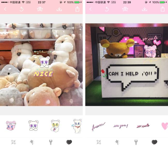 BECA 是 TINKYS 出品的系列摄影应用,共有 BECA Berry、BECA Blue、BECA Peach、BECA Bear 、BECA Bad、BECA Belle、BECA Kisses、BECA Bubbles 八款。这一系列的应用功能大同小异,除了裁剪图片、调整亮度对比度之类的图像参数等基本功能之外,最大的卖点就是它的贴纸啦,全都由插画家手工绘制,尤其是白色小熊的形象非常可爱,整个应用界面也是柔和的粉蓝色调,搭配得很舒适。