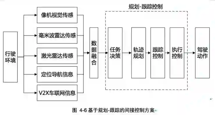 自动驾驶间接控制是一类基于规划-跟踪的主流智能驾驶车辆控制方法。根据当前车辆行为需求,在满足车辆自身运动学和动力学约束条件下规划出一条空间上可行且时间上可控的无碰撞安全运动轨迹,然后设计适当的控制律跟踪生成的目标轨迹,从而实现自主驾驶。如下图所示