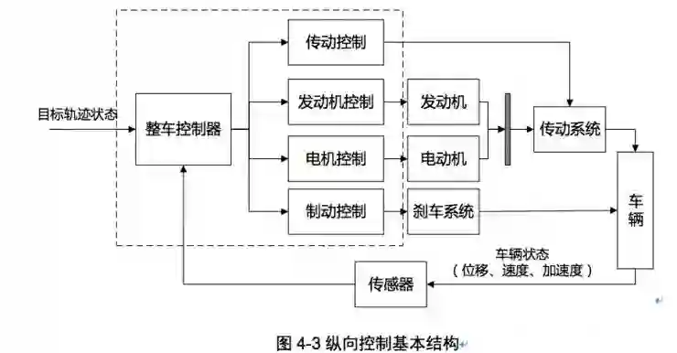 车辆纵向控制是在行车速度方向上的控制,即车速以及本车与前后车或障碍物距离的自动控制。巡航控制和紧急制动控制都是典型的自动驾驶纵向控制案例。这类控制问题可归结为对电机驱动、发动机、传动和制动系统的控制。各种电机-发动机-传动模型、汽车运行模型和刹车过程模型与不同的控制器算法结合,构成了各种各样的纵向控制模式,典型结构如图所示。此外,针对轮胎作用力的滑移率控制是纵向稳定控制中的关键部分。