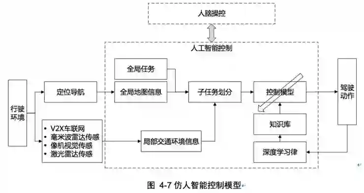 基于人工智能决策控制模型本质上是模拟人脑对外界环境信息和车体本身信息的感知(图 4-7),同时由驾驶经验并同在线学习机制来获得持续稳定输出的过程。