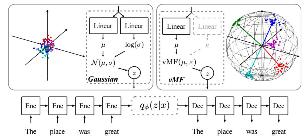 图 1:基于高斯先验(左)和 vMF 先验(右)的神经变分 RNN(NVRNN)语言模型。首先由编码器模型计算变分近似 q_φ(z|x)(虚框)的参数,然后采样 z 并由 z 生成词序列 x。图中显示了来自 N (0, I) 和 vMF(·,κ = 100) 的样本,后者都分布于单位球表面。虽然κ可以从编码器网络中预测出来,但实验发现将κ固定可以得到更稳定的优化和更好的性能。