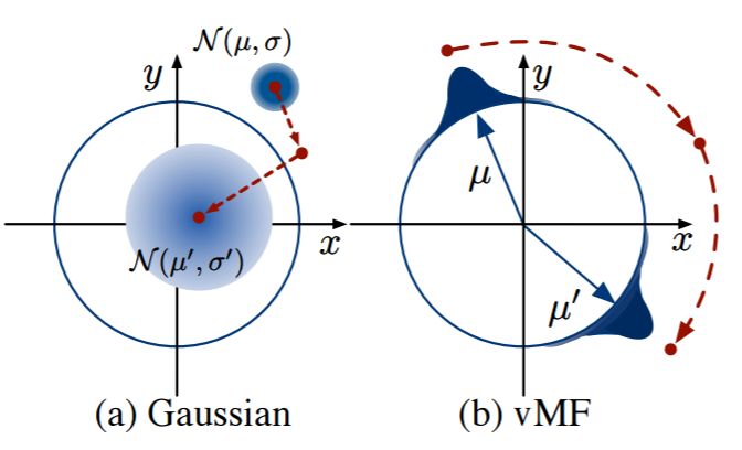 图 2:学习过程中单个样本的 q 随时间变化的优化可视化。在高斯情况下,KL 项使模型更趋于先验(由µ, σ 到µ', σ'),而在 vMF 中,不存在趋向单一分布的情况。