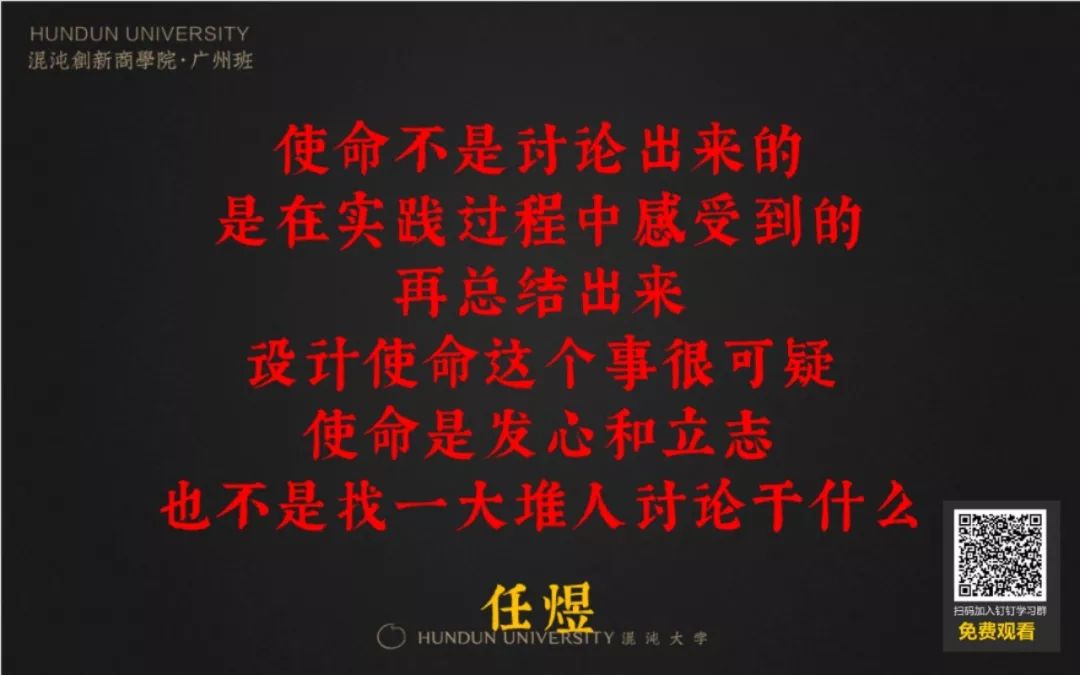 另外特别关键的是,使命不是讨论出来,是你在实践过程中感受到之后再总结出来。我特别怕很多人一天想着怎么找使命,因为那不是找的。所以对设计使命这事,我是很怀疑的。使命在我看来是发心和立志,不是找一大堆人讨论干什么,你发一个心是什么?你那个心有了,你要立下来的志向是什么?那个东西会指向发心。
