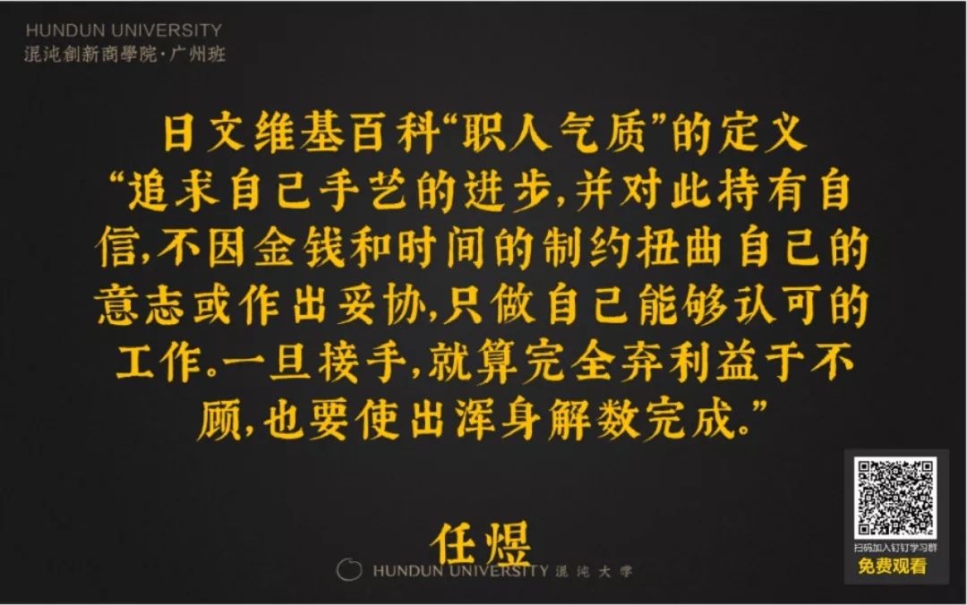 所以李善友教授那天讲寿司之神小野二郎,其实在个人使命上最重要的是什么?就是职人精神,职人气质。日本维基百科对职人气质的定义是什么?追求自己手艺的进步,并对此持有自信,不因金钱和时间的制约,扭曲自己的意志或做出妥协,只做自己能够认可的工作。一旦接受,就算完全弃利于不顾,也要使出浑身解数出来。