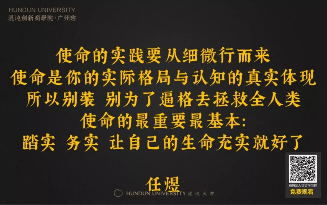 我建议大家,有什么理念,使命也好,其实别随随便便和世界联系。什么意思?使命的实践是要从细微行为,未来的使命其实是你的实际格局和认知的真实体现,我觉得非得找一个大师名没啥意思。所以我说别装,别为了逼格去拯救全人类。