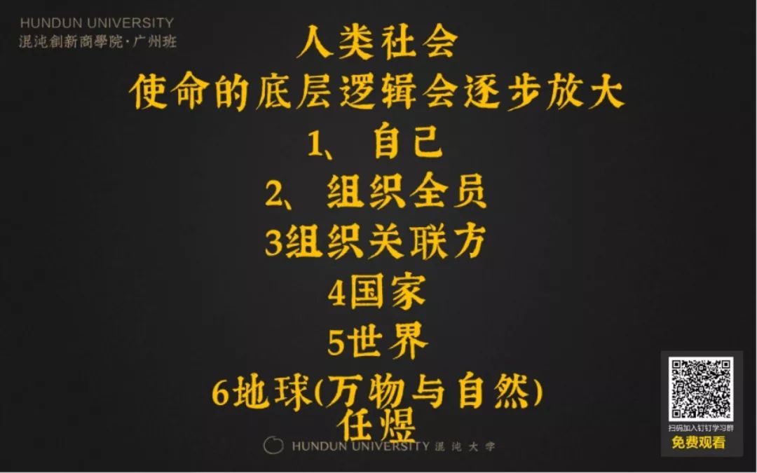 随着人类社会发展,如果你的觉悟不断提升的话,使命的底层逻辑是可以逐步放大的,就是从自己到组织的全员到组织的利益相关方,再到你的国家,再到整个世界,再到地球,万物为自然,你自然会把自己的范围扩展出去。