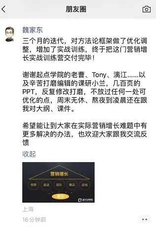 为了帮助大家更好的理解和掌握营销的用户、渠道、传播整合策略,解决用户拉新、留存、收入转化等增长问题,推荐由起点学院联合美图秀秀副总裁@陈辉老师、《极限挑战3》宣传顾问@魏家东老师,共同打磨迭代的【营销增长实战训练营】