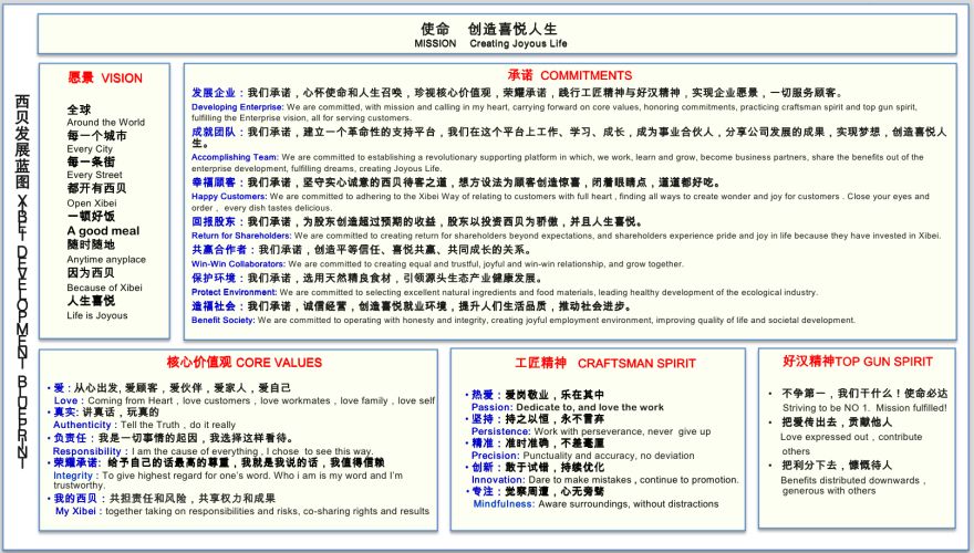 在“西贝蓝图”里,西贝的愿景是“全球每一个城市、每一条街,都开有西贝,一顿好饭、随时随地,因为西贝,人生喜悦”。