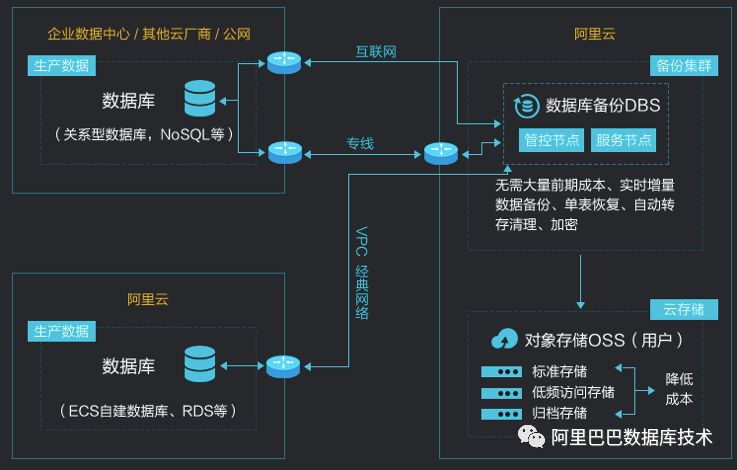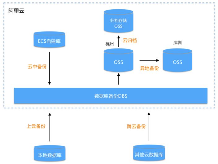 你的数据库在非阿里云的云环境上,如果数据库已开通公网可以使用数据库备份DBS直接备份,或者通过部署代理、开通阿里云专线,都可以使用数据库备份DBS将数据备份到OSS上,在阿里云上做跨云备份