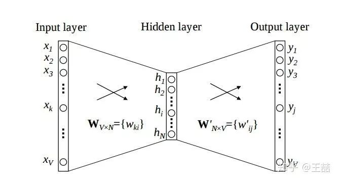 分别是词w的输出向量表达和输入向量表达。那什么是输入向量表达和输出向量表达呢?我们画一个word2vec的神经网络架构图就明白了。