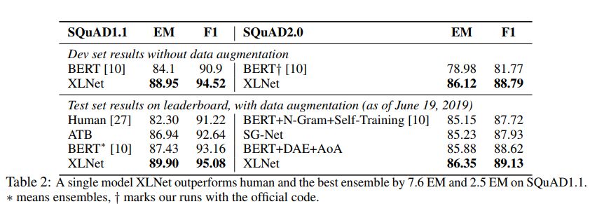 表 2:单模型的 XLNet 在 SQuAD1.1 数据集上的表现分别比人类和当前最好模型超过了 7.6EM 和 2.5EM。