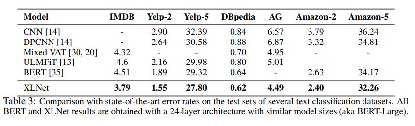 表 3:在一些文本分类数据集的测试集上与当前最优的误差率进行对比。所有的 BERT 和 XLNet 结果都通过同样模型大小的 24 层架构(相当于 BERT-Large)获得。