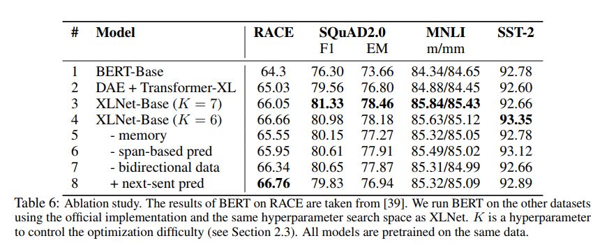 表 6:控制变量测试。其中 BERT 在 RACE 上的结果来自论文 [39]。研究者使用 BERT 的官方实现在其他数据集上运行,且它具备与 XLNet 相同的超参数搜索空间。K 是控制优化难度的超参数。所有模型都在相同数据上预训练而成。
