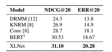 表 5:在 ClueWeb09-B 测试集(一项文档排名任务)上对比 XLNet 和当前最优方法的性能。† 表示该研究所做的实现。