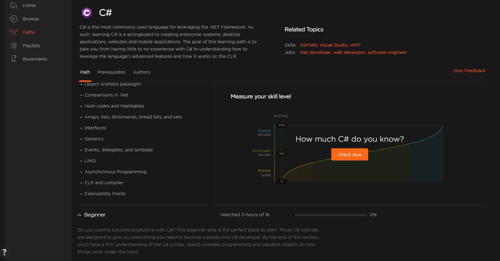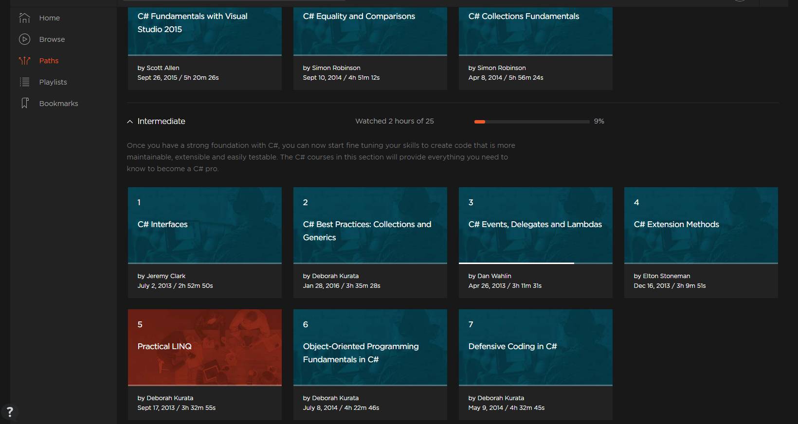 Pluralsight:全部都是技术类教学视频。有些视频出自大牛,例如 Jon Skeet。部分视频带有英文字幕。视频内容翔实丰富,且十分与时俱进,在 ASP.NET Core 出来仅仅一个星期,就有了关于它的教学视频。最近网站改版,对于某些话题还添加了学习之路功能,例如以下的视频是关于 C#的学习之路,分为简单,中等和高级。