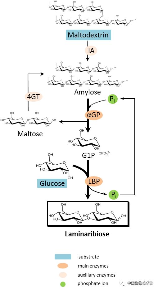 中国科学院天津工业生物技术研究所研究员游淳带领的体外合成生物学中心研究团队,设计了将廉价底物淀粉和葡萄糖一步转化为昆布二糖的体外多酶催化系统。该体系包括α-葡聚糖磷酸化酶(α-glucan phosphorylase, αGP)和昆布二糖磷酸化酶(laminaribiose phosphorylase, LBP),其中αGP将淀粉转化成高能磷酸化糖(葡萄糖1-磷酸,G1P),LBP将葡萄糖和G1P催化合成昆布二糖;此外,添加异淀粉酶(isoamylase,IA)和4-葡聚糖转移酶(4-glucanotransferase,4GT)两个辅助酶可以提高昆布二糖产率;最终通过反应体系优化,基于淀粉的昆布二糖的产率进一步提高至91.9%。为验证该反应路径的工业潜力,该研究团队提高了底物淀粉和葡萄糖的浓度,最终可以得到61.2 g/L昆布二糖。这条新的酶法制备二糖系统可以成为未来二糖的生产平台,通过替换糖苷磷酸化酶可以合成不同二糖,为以淀粉为底物生产其他二糖奠定了基础。