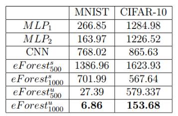 高效性:eForest 在单块 KNL(多核 CPU)上训练的速度甚至比 CNN 自编码器在 Titan-X GPU 上还快。