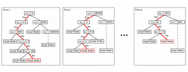 实际上,森林一般可以从每棵树的根结点传播到叶结点而进行前向预测,但并不明确如何进行后向重构,即如何从叶结点中获得的信息推出原始样本。