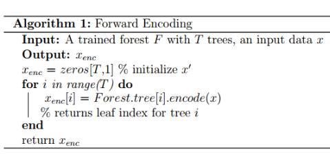 首先,我们提出了 EncoderForest 的编码过程。给定树型集成模型(T 棵已训练的树),前向编码过程接受输入数据并将其发送到集成方法中每棵树的根结点,一旦数据遍历(traverse)到所有树的叶结点,该过程将返回 T 维向量,每个元素 t 是树 t 中的叶结点的整数索引。
