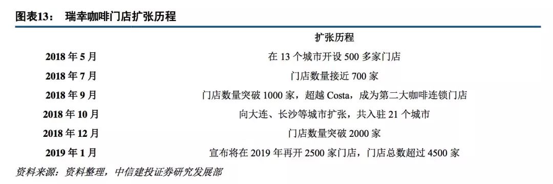 自在北京银河SOHO设立第一家门店以来,瑞幸咖啡在5月底已进入13个城市并开设500多家门店,9月门店数量达到1003家,超越Costa,成为仅次于星巴克的第二大咖啡连锁门店,并在12月门店数量达2000家。