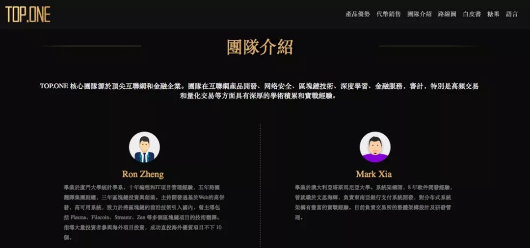 打开Top.one的官网,在其创始团队介绍一栏里,所有的成员均以英文名及卡通形象示人,(插图)郑荣树对36氪解释道,“这个做法我们并不是原创,币圈很多都这么干,IOST, DATA也都是卡通形象,主要我们是考虑保护团队的隐私,不想影响团队成员的日常生活。”