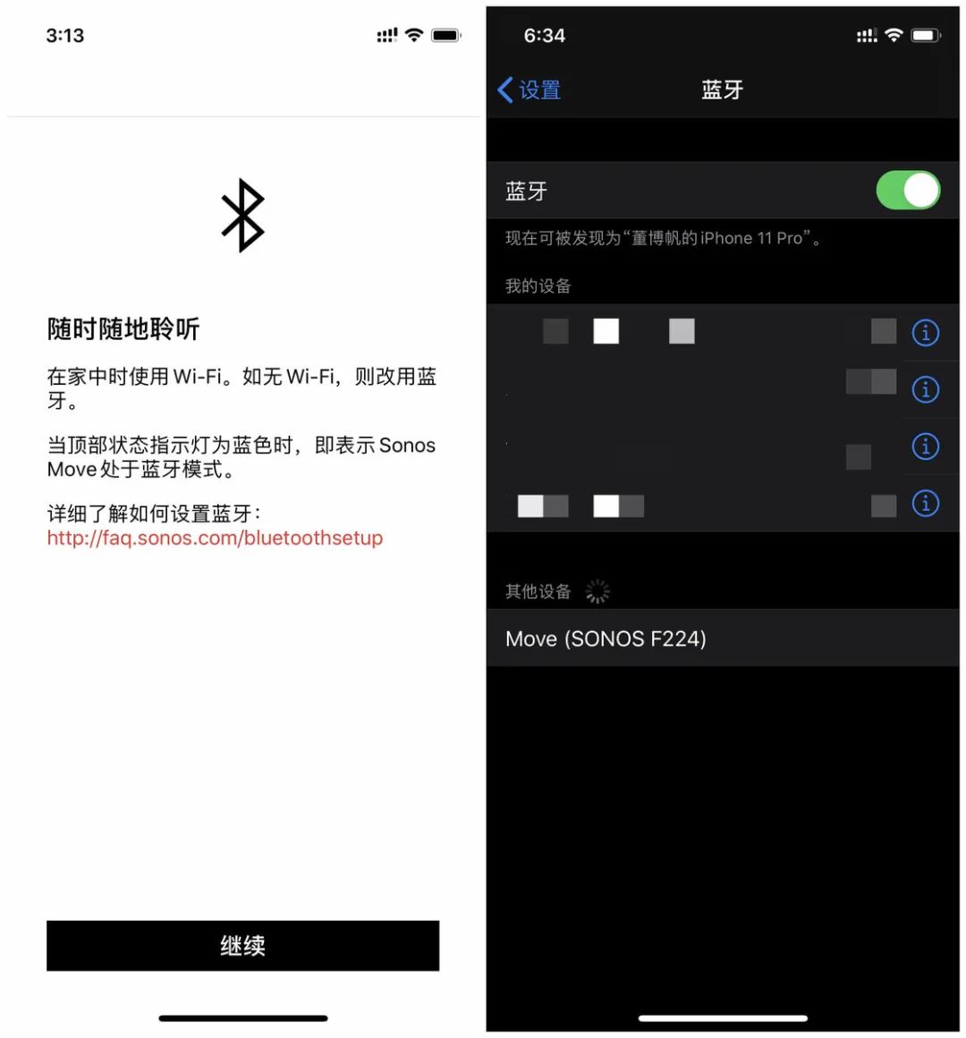 如果我需要切换到蓝牙模式,只需按一下蓝牙 / Wi-Fi 切换按钮,Sonos Move 顶部面板的状态指示灯就会闪烁蓝色,这时候就可以在终端设备的蓝牙设置里找到 Sonos Move 了,配对后即可使用任意流媒体 App 播放音乐。