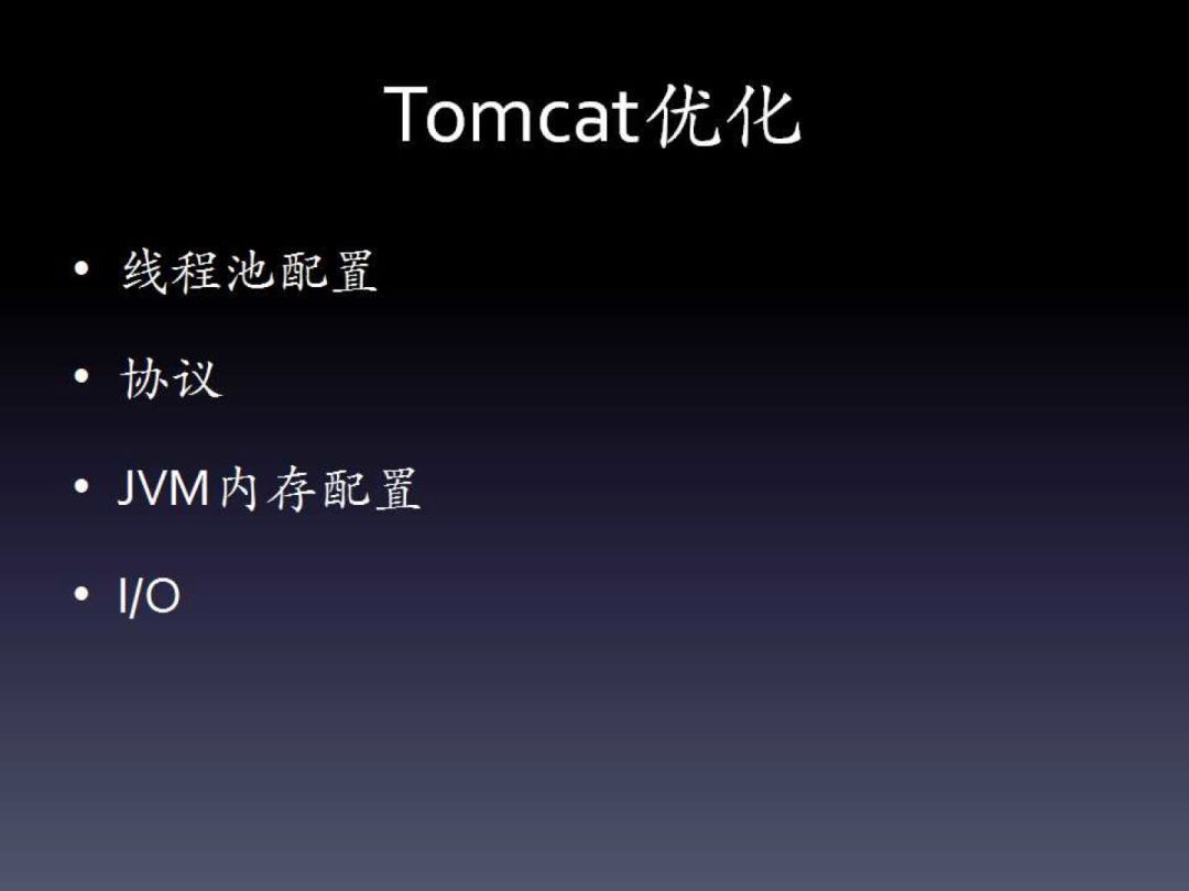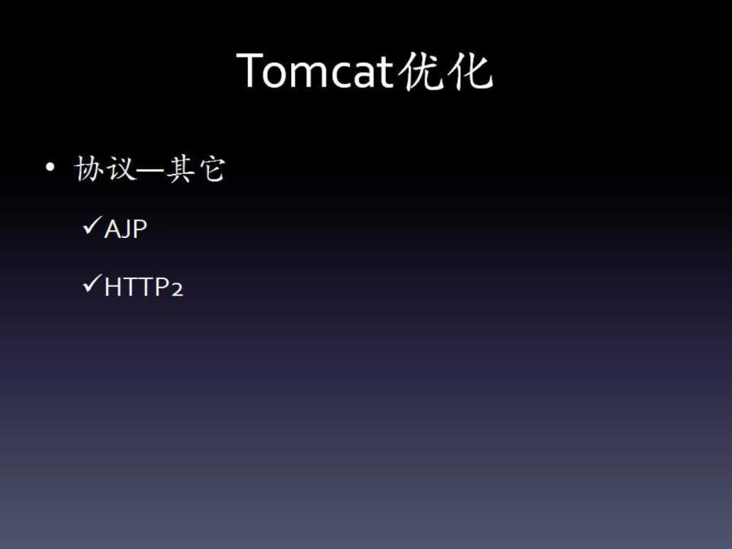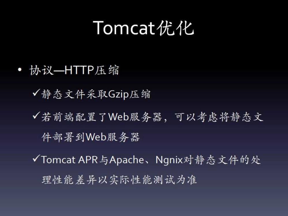 协议层面。这个最常见的就是开启HTTP GZip压缩。如果配置了前置的Web服务器,那么静态文件可以考虑直接放到Web服务器上,然后可以修改HTTP链接器的I/O方式。新版本的Tomcat默认是NIO,可以改为APR,后者可以充分发挥本地调用的优势,与直接使用Apache基本是类似的。