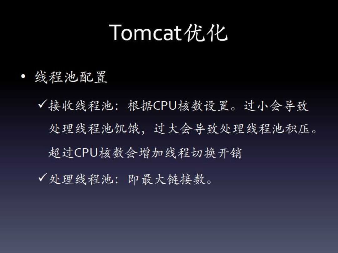 线程池就是我们刚才说的两类。接收线程池一般都是CPU内核数即可。当然如果服务器核数非常多,可以适当调小。这个线程池处理速度比请求处理线程池要快的多,因此要考虑这两者的匹配,原因PPT中都介绍了。