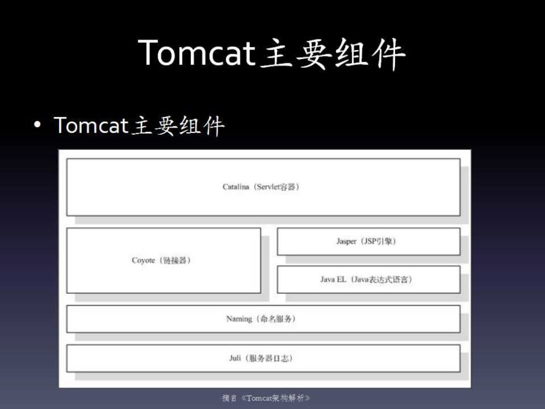 Tomcat的主要组件可以看一下下面这张图:它底层通过Java命名服务统一对各种组件进行管理,体现了服务器软件的“管理”特性;然后是链接器实现Coyote和Jasper JSP引擎。