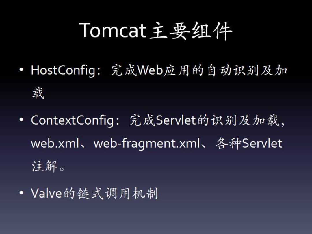 HostConfig主要用于扫描Web应用,自动根据Web应用目录创建Context。ContextConfig重点处理Servlet规范,生成Servlet、Filter等各种规范组件。最后,Tomcat自身也实现了一种链式的请求处理机制,这一点和规范中的Filter类似,这就是Valve。