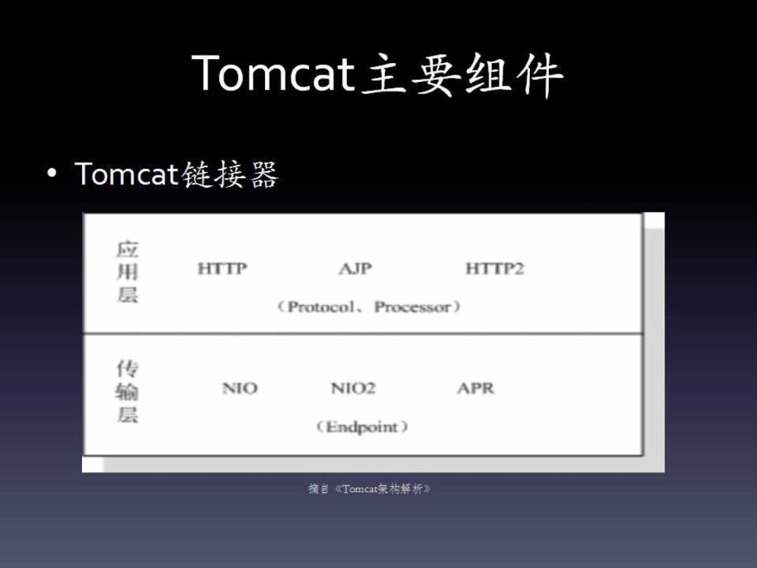 应用层里,最新版本的Tomcat支持HTTP、AJP以及HTTP2,传输层支持NIO、NIO2以及APR,最新版本已经不支持BIO。