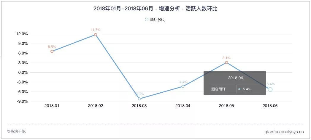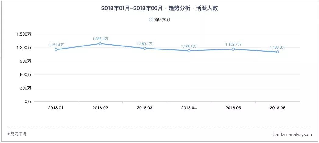 2018年6月份,酒店预订应用月活跃用户规模为1100.3万,环比下降5.4%。