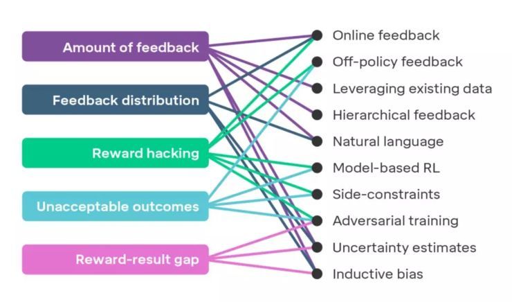 如果想将奖励模型应用到复杂的问题上,有几项挑战依然等待着我们去克服。下图展示了5项在研究中可能面临的挑战,对此感兴趣的同学可以查阅DeepMind论文,文中详细描述了这些挑战及对应的解决方案。