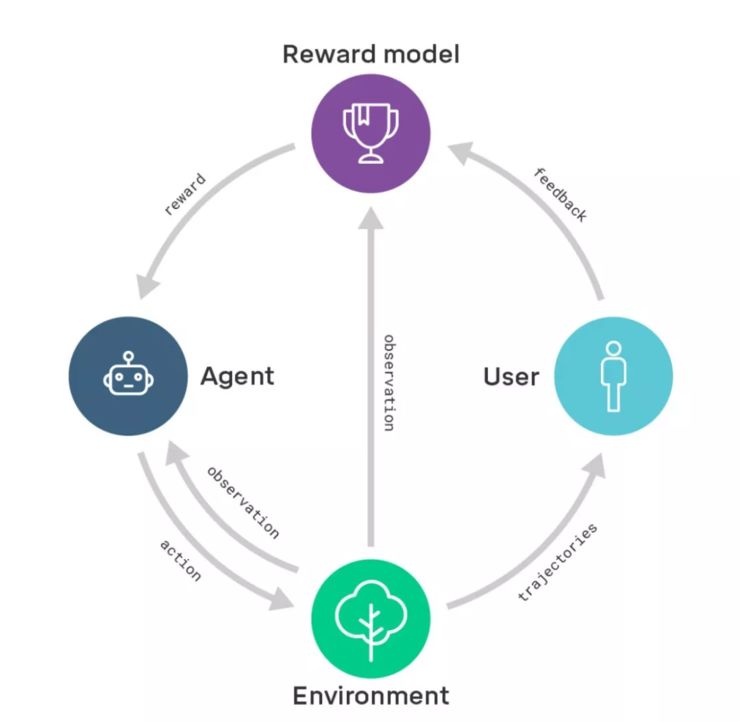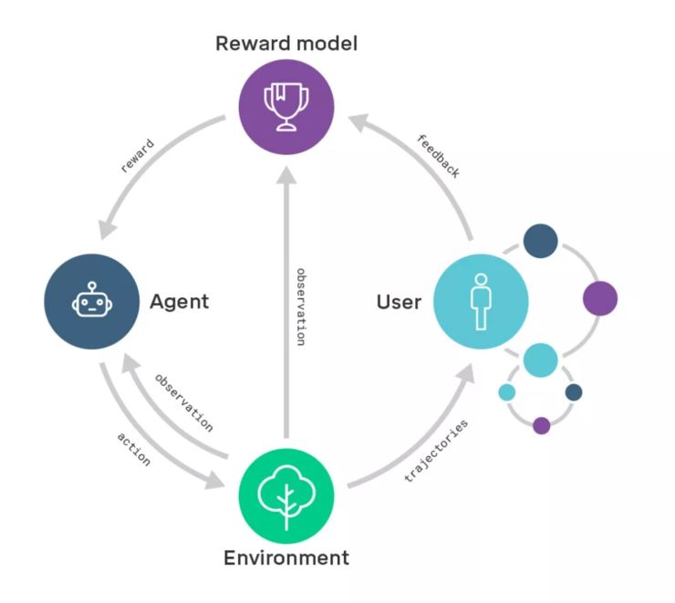 奖励建模示意图:奖励模型基于用户反馈进行训练,以便更好地捕捉用户意图;同一时间,奖励模型为经过强化学习训练的智能体提供奖励。