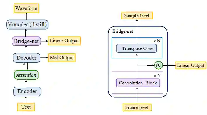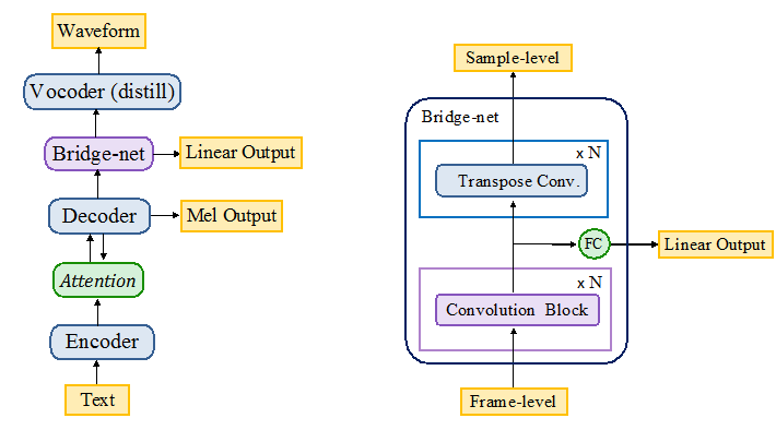 ClariNet 的网络结构如下图所示。它使用基于注意力机制(Attention)的编码器-解码器(Encoder-Decoder)模块来学习文本字符与频谱帧之间的对齐关系。解码器的隐状态(hidden states)被送给 Bridge-net 来进行时序信息处理和升采样(upsample)。最终 Bridge-net 的隐状态被送给音频波形生成模块(Vocoder),用来最终合成原始音频波形。