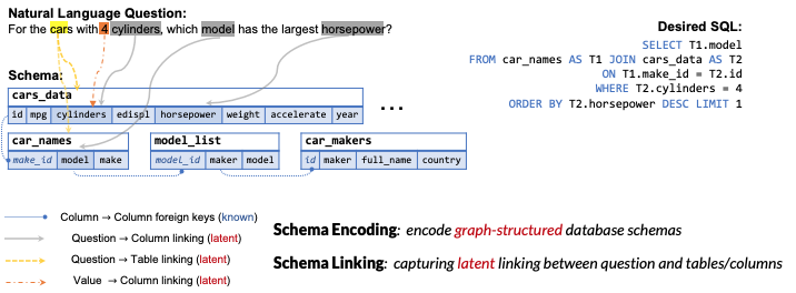 模式编码是指如何编码数据库信息,因为数据库由多个主外键相连的表格构建而成,它本身是一个图的结构,如何编码这种图结构对算法提出了比较大的挑战。模式链接是指用户的问题中有一些词或显式或隐式地提到数据库模式,比如这里的cars就关系到表名cars_data和列cars_name。如何把问题和数据库模式的这种关系让模型感知到就是模型设计的另一个关键。