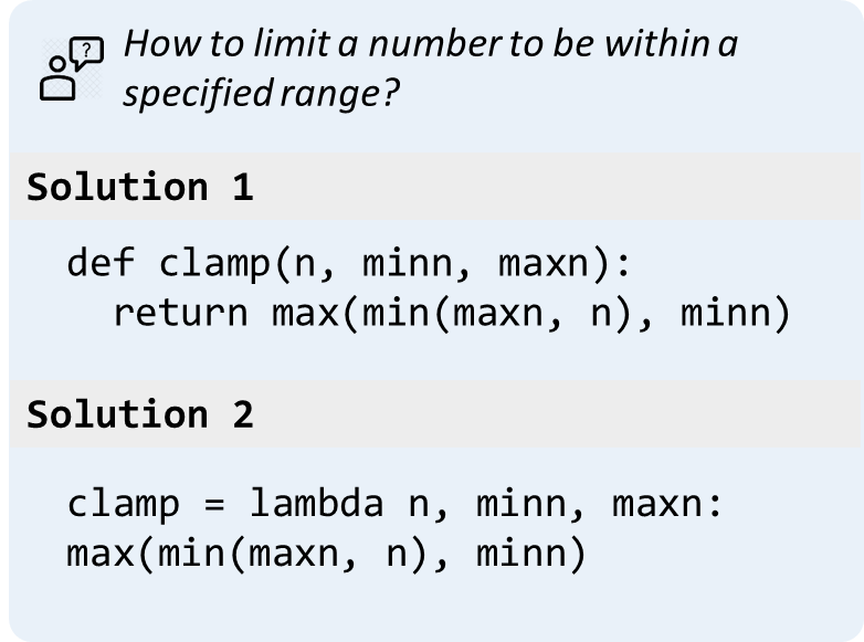 姚子瑜: 前一位嘉宾介绍了代码生成,那我接下来要介绍的技术与代码生成联系是非常紧密的,它就是代码检索(Code Search/Code Retrieval)。当用户用自然语言提问时,假设我们有一个非常大的代码库,我们希望从这个大的代码库中检索到对用户而言最有用的,最能帮助用户回答问题的代码。下图展示了StaQC数据集 [6] 中的一个示例。