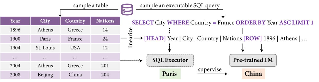 刘乾: 不同于上两个预训练模型最终的应用场景是输出SQL,TAPEX [21]的目标是增强模型在弱监督场景下的性能。它的下游模型在接受自然语言问题和表格作为输入后,直接输出其对应的答案。因此呢,TAPEX 提出的目的就在于提升下游模型在理解表格结构以及在表格上进行推理的能力。那如何增强下游模型对表格的推理能力呢,TAPEX给出的答案是:让模型去模仿学习一个SQL执行器的行为。如果一个神经网络都能学会执行如此复杂的SQL,并给出它正确的执行结果,那我们可以预期它对表格的结构也好,在表格上的推理能力都应是相当强的。TAPEX的实验也验证了,就只需要在这种SQL和其执行结果的纯合成的数据上做预训练,TAPEX也能在四个不同的数据集上都获得最好的性能。