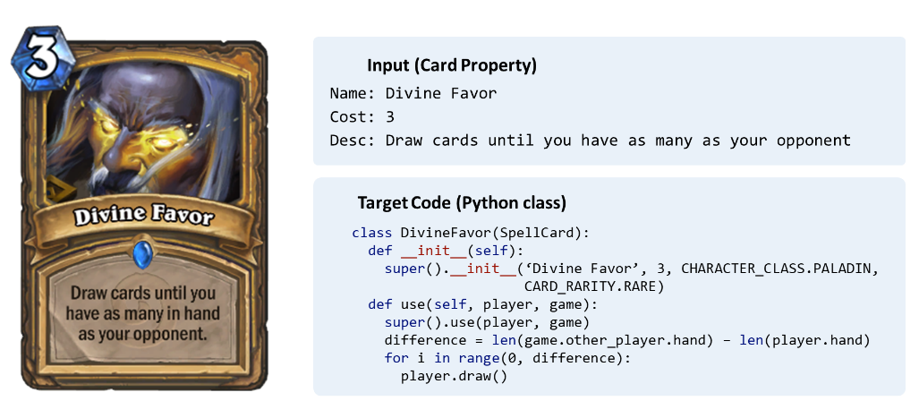 殷鹏程: 刚刚两位讲到了如何将自然语言转换成SQL语句这种领域相关的代码(Domain-Specific Language, DSL),其实语义解析还可以用在更广泛的范畴,比如说通用的代码生成(Code)。在代码生成领域,第一项工作是由DeepMind于2016年发布的HeartStone数据集[3]。在这个数据集的设定下,系统所接受的自然语言的输入并不是一个用户提交的问题,而是一组关于炉石传说卡牌的描述,系统的目标就是生成一串能够实现这个卡牌的代码。一个包含输入、输出的示例如下图: