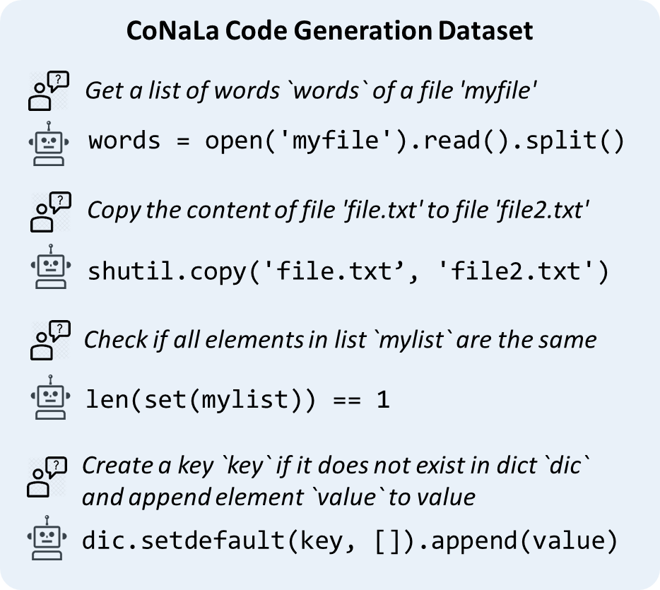 其实呢,除了炉石传说这种特定领域下的代码生成,我们还可以考虑开放领域下的代码生成。下图是CoNaLa数据集,是由我们团队在2018年构建的[4],它的目标是能够自动化地把一个程序员的自然语言问题变成相应的Python代码实现。这个数据集是源自一些知名的编程问答平台(如StackoverFlow)上网友提问的问题,和其他网友贡献的一些Python实现。但是,想从这样的平台上自动抽取干净的平行语料还是比较困难的,我们团队当时构建了一个模型来自动地抽取这样的数据对。有了这些数据对后,我们邀请一些程序员对这些数据对进行进一步的过滤和修正,最终就可以得到CoNaLa这个数据集。