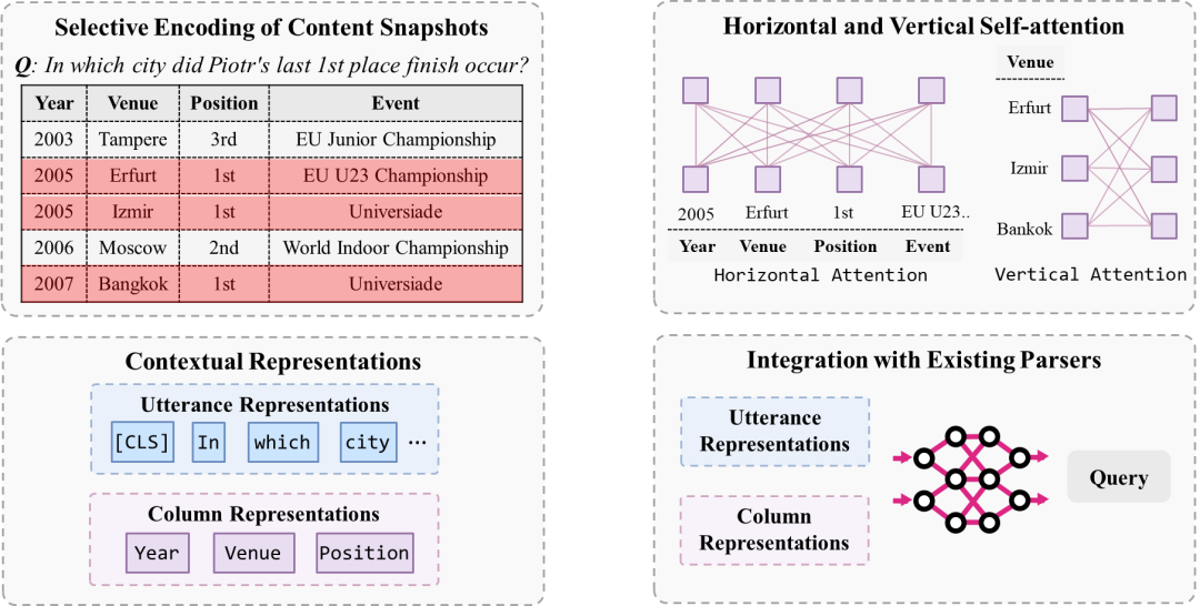 殷鹏程: 针对以上问题,我们提出了一个可以增强表格理解的预训练语言模型TaBERT [18]。该模型设计的主要一个出发点在于,现实生活中表格会非常长,比如商用系统中的数据表可能有成千上万行。所以,第一步要先做一个数据精简,即下图中的选择编码(Selection Encoding)。以下图中的问题为例,当用户提问 In which city did Piot’s last 1st place finish occur? TaBERT首先会选几个与问题相关的行(下图红色所示),然后只需要编码它们即可。有了精简的表格后,接下来的一个关键问题在于,如何修改Transformer从而让它能够理解结构化的表格知识。TaBERT通过扩展传统的自注意力(Self Attention),让模型既能注意到水平方向的其他格,也可以注意到垂直方向的其他格的内容。TaBERT最终的输出不仅包括了用户问题的表示,还包括了表格中的每个表头的表示。这些表示可以被下游的语义解析模型用到,从而解码得到对应的编程语言。