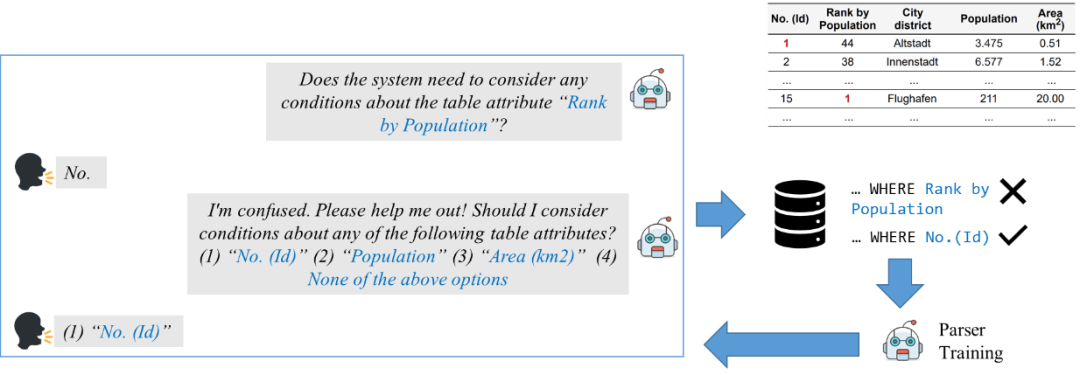 姚子瑜: 当用户问的问题里有歧义时,或者系统不理解用户的问题时,我们希望系统能够主动地提出一些澄清式问题以从用户的反馈中学习。如下图所示,当系统不理解用户提出的问题时,可以通过用户的反馈(比如做下图的多选题)来告诉系统在这种提问下应该如何决策。在我们的工作中 [22],我们实现了刚才所描述的系统,期望系统在部署后可以通过与用户源源不断的交互来持续提高在编程语言生成的能力。同时这种系统还可以在线上收集更多平行语料。