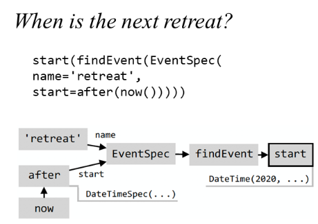 姚子瑜:如上位嘉宾所说的,当任务型对话复杂到一定程度后,解决方案最终其实会收敛到语义解析的方法。例如,去年微软Semantic Machines 团队就发布了一个数据集 SMCalFlow [8],将语义解析方法直接用在了任务型对话中。下图展示了该数据集中的一个示例,大家可以看到相比TOP而言,这个数据集中的代码要更加复杂。而这种代码设计的主要动机在于更好地处理用户自然语言中组合式(Compositional)的语义。