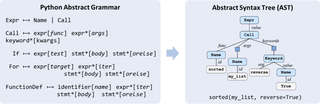殷鹏程: 语义解析领域下其实囊括了许多不同的任务,如NL-to-SQL, NL-to-Python等。不同任务其实需要不同的领域知识(Domain-specific Knowledge),其中很重要的一种知识就是生成代码本身要遵从的对应语法(Grammar)。下图右侧是一段Python代码和它所对应的抽象语法树(Abstract Syntax Tree),左侧则是Python的语法。不难看出,Python的语法中其实蕴涵了许多对模型输出空间的约束,例如,一个Expr (即表达式)只能展开成一个 Name (即变量名) 或者一个 Call (即函数调用)。
