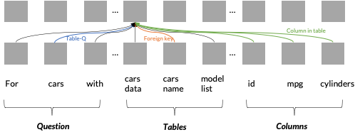 为了更好地解决这两个挑战,我们在Transformer的基础上提出了关系感知的编码方法RAT-SQL [16]。模型的输入包含三部分,包括了用户的问题,数据库表名和数据库列名。比如下面这个例子,模型在编码 cars_data的时候会考虑到若干种关系,如cars_data 与用户问题中cars一词的链接关系,再如cars_data与其表内列名在同一个表的关系等。在具体实现时,这些关系会被加入到自注意力层种,从而让Transformer能够更好地感知和表示关系。