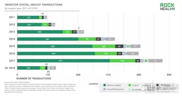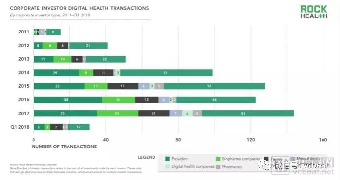 许多企业投资者被归类为“其他”,因为他们不属于传统的医疗护理公司类别。这些公司包括通用电气、亚马逊、百思买、苹果、百度等非传统企业,他们对数字医疗康初创企业表现出持续的兴趣,但通常是为了推进自己的医疗战略。