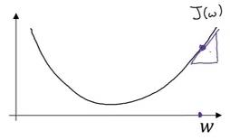 对于导数更加形象化的理解就是斜率(slope),如图该点的导数就是这个点相切于 J(w)的小三角形的高除宽。假设我们以如图点为初始化点,该点处的斜率的符号是正的,即dJ(w)/dw>0,所以接下来会向左走一步。