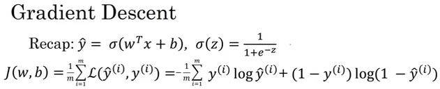 可以用如图那个小红点来初始化参数 w 和 b,也可以采用随机初始化的方法,对于逻辑回归几乎所有的初始化方法都有效,因为函数是凸函数,无论在哪里初始化,应该达到同一点或大致相同的点。