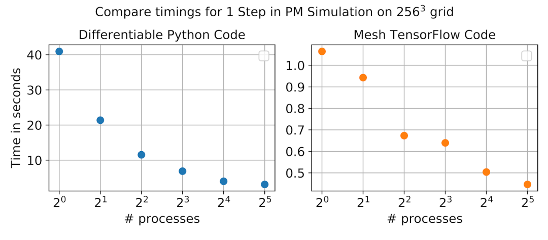 Mesh TensorFlow 框架让我们能轻松地用分布式张量描述模拟,并在幕后持续跟踪设备间的分布式梯度和内存通信。通过在 Mesh TensorFlow 中编写 N 体解算器,我们可以将这些超级计算机上的庞大模拟量分布在多台设备之间。在此种模拟中,每个处理和网格组件在每个时间步下都会演化出不同的空间区域。使用相同的模拟代码,我们可以同时在云 TPU 上演化 128 个网格尺寸为 128x128x128 的独立宇宙,或者在 NERSC 等国家计算机设施的 64 个 GPU 上演化单个网格尺寸为 1024x1024x1024 的宇宙。除支持大型模拟之外,模型并行框架还允许我们通过在多个处理器之间分配计算来加速中间尺寸的模拟。如下方图 4 所示,我们可以看到,FlowPM 模拟的平均速度是当前可微分 python 模拟 FastPM 的 40 倍。